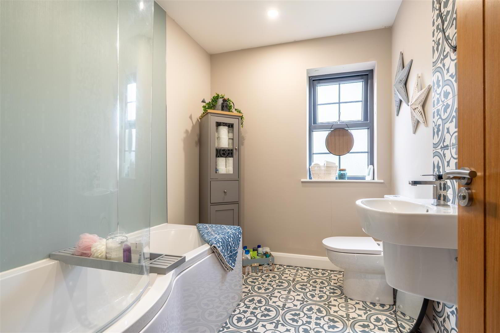 Modern white suite comprising a 'P' shaped panel bath with PVC panelled walls, 'Drench' shower head and secondary shower attachment. Half pedestal wash hand basin with 'Monobloc', chrome mixer tap, floor to ceiling decorative tiled splashback and wiring for powered mirror. Low flush push button WC. Decorative tiled flooring. Low voltage down lighting. Extractor fan. Chrome towel radiator.