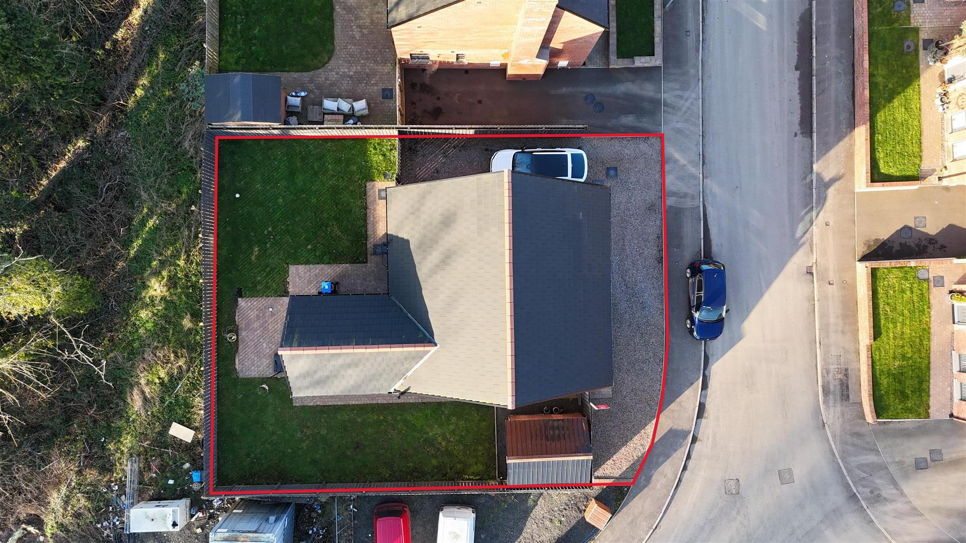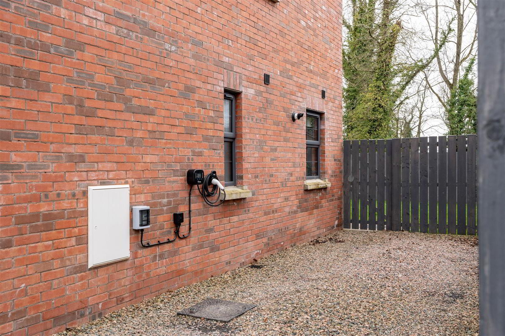 Gravel drive with space for up to 4 cars. Timber Pedestrian gate to the rear. Outside lighting.