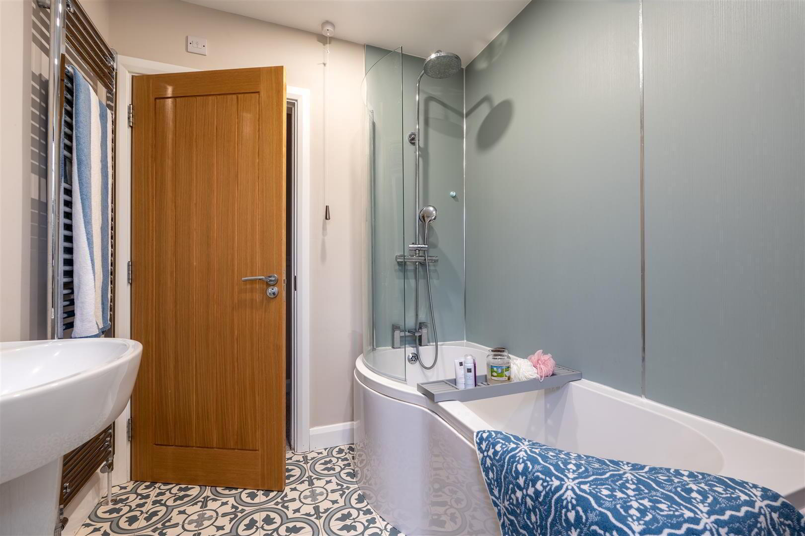 • Family bathroom to include a 'P' shape panel bath with shower over / Pressurised water system