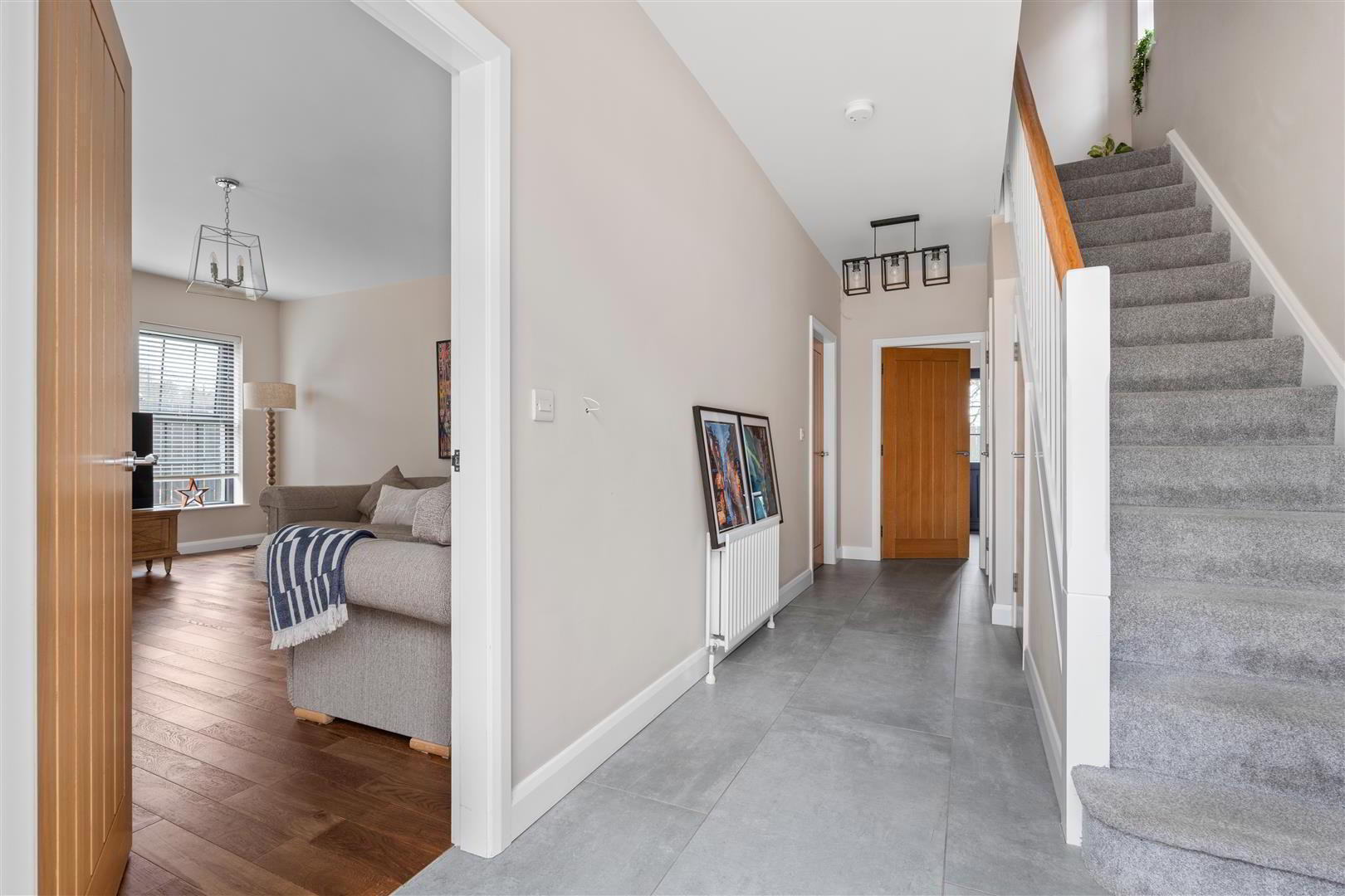 • Spacious entrance hall with ceramic floor tiling / staircase to first floor with oak moulded handrail and white painted redwood spindles