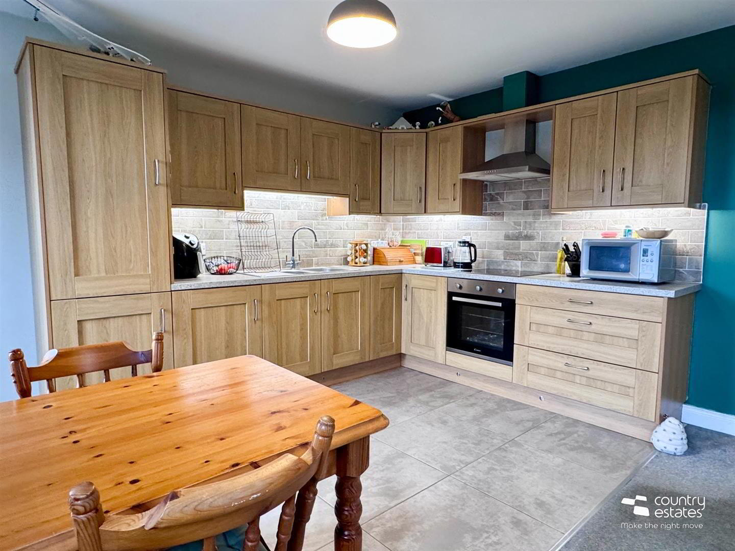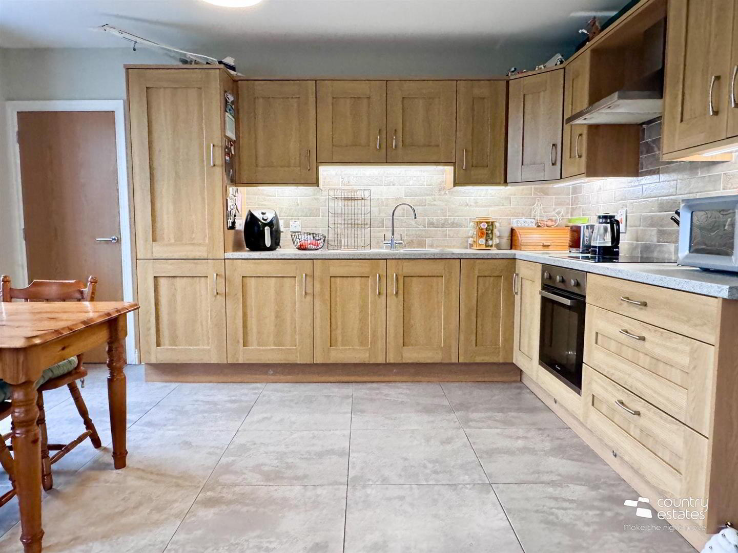 - At max. Dual window aspect. Equipped with a comprehensive range of high and low level fitted shaker style units with contrasting work surfaces. A host of integrated appliances including oven with 4 ring hob. Overhead extractor fan housed in stainless steel chimney. Fridge Freezer, Washer/ dryer. Single drainer sink unit with swan neck mixer tap. Part tiled walls. Part tiled floor. Large storage cupboard. Dual window aspect in Living area.