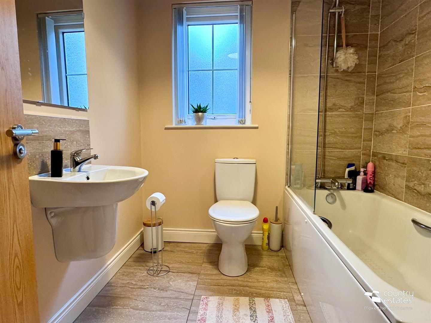 - Comprising panelled bath with fixed shower screen and shower attachment, button flush w.c. and semi pedestal wash hand basin with mono block tap and tiled splashback. Tiled floor. Part tiled walls.