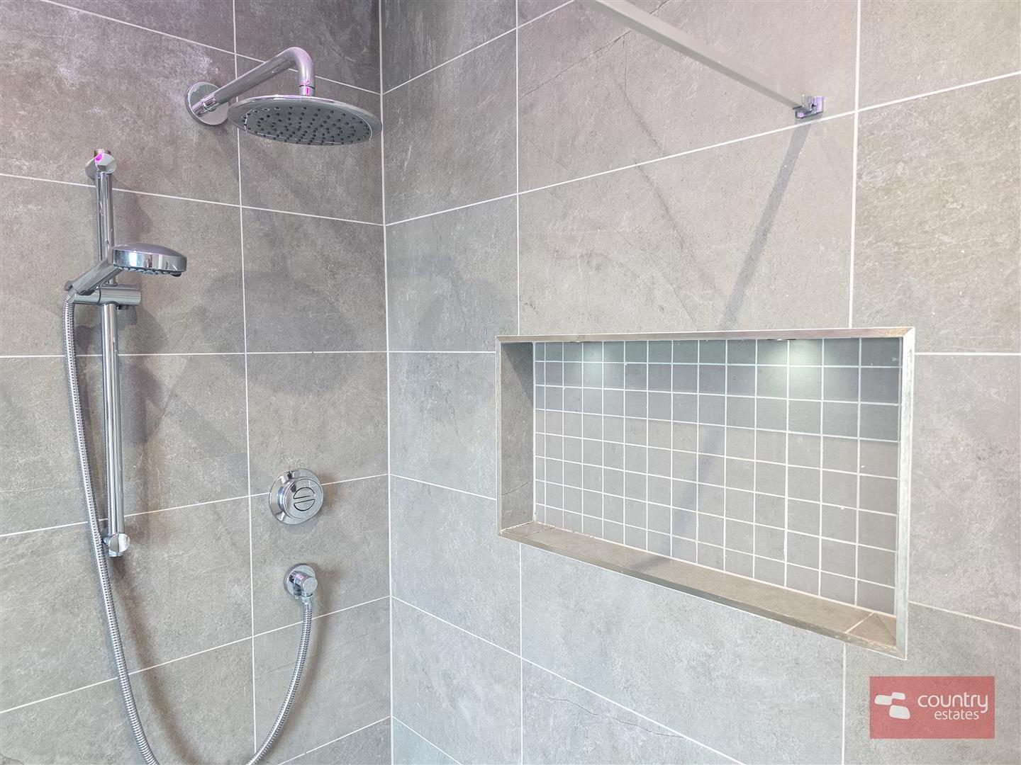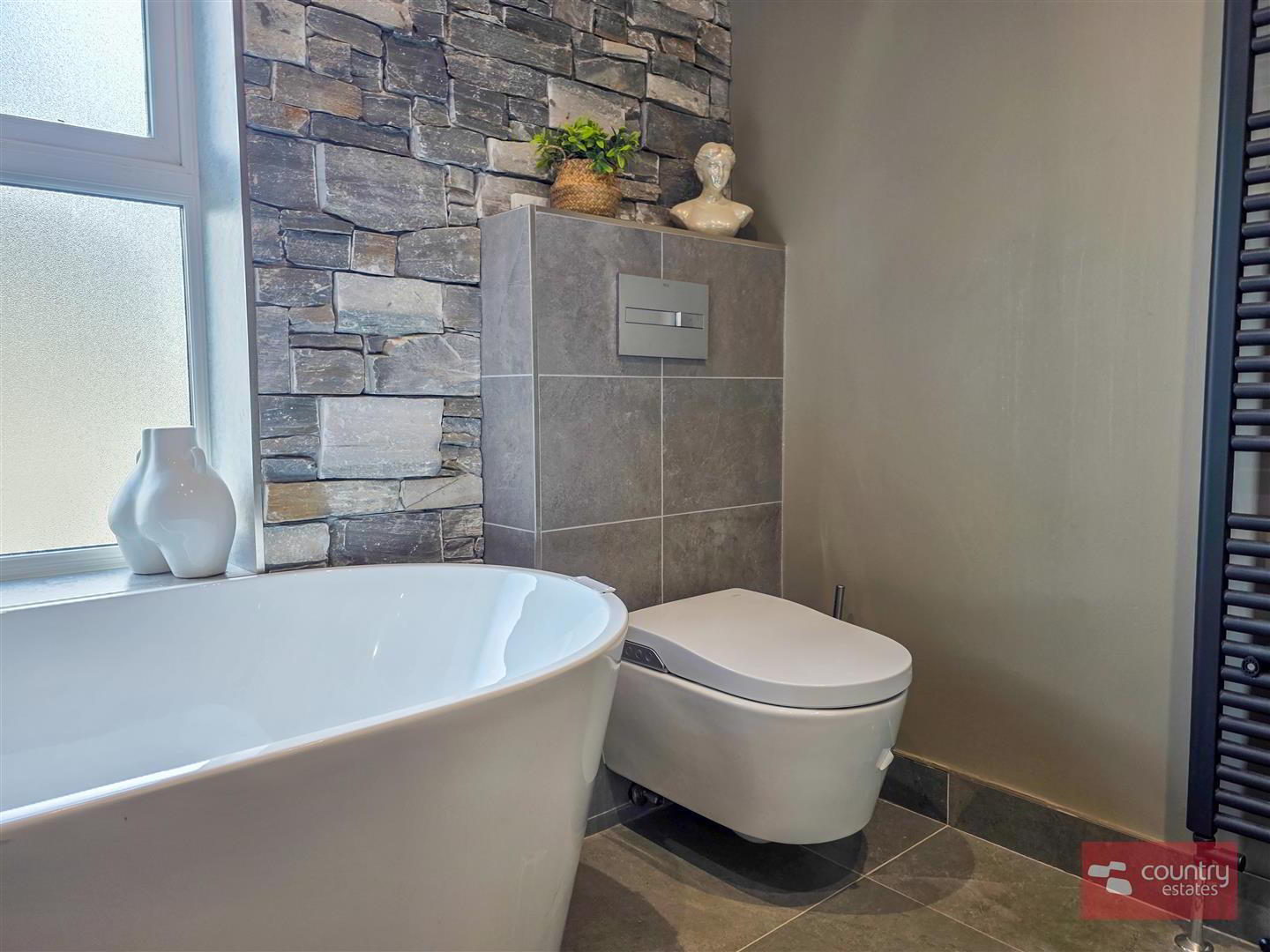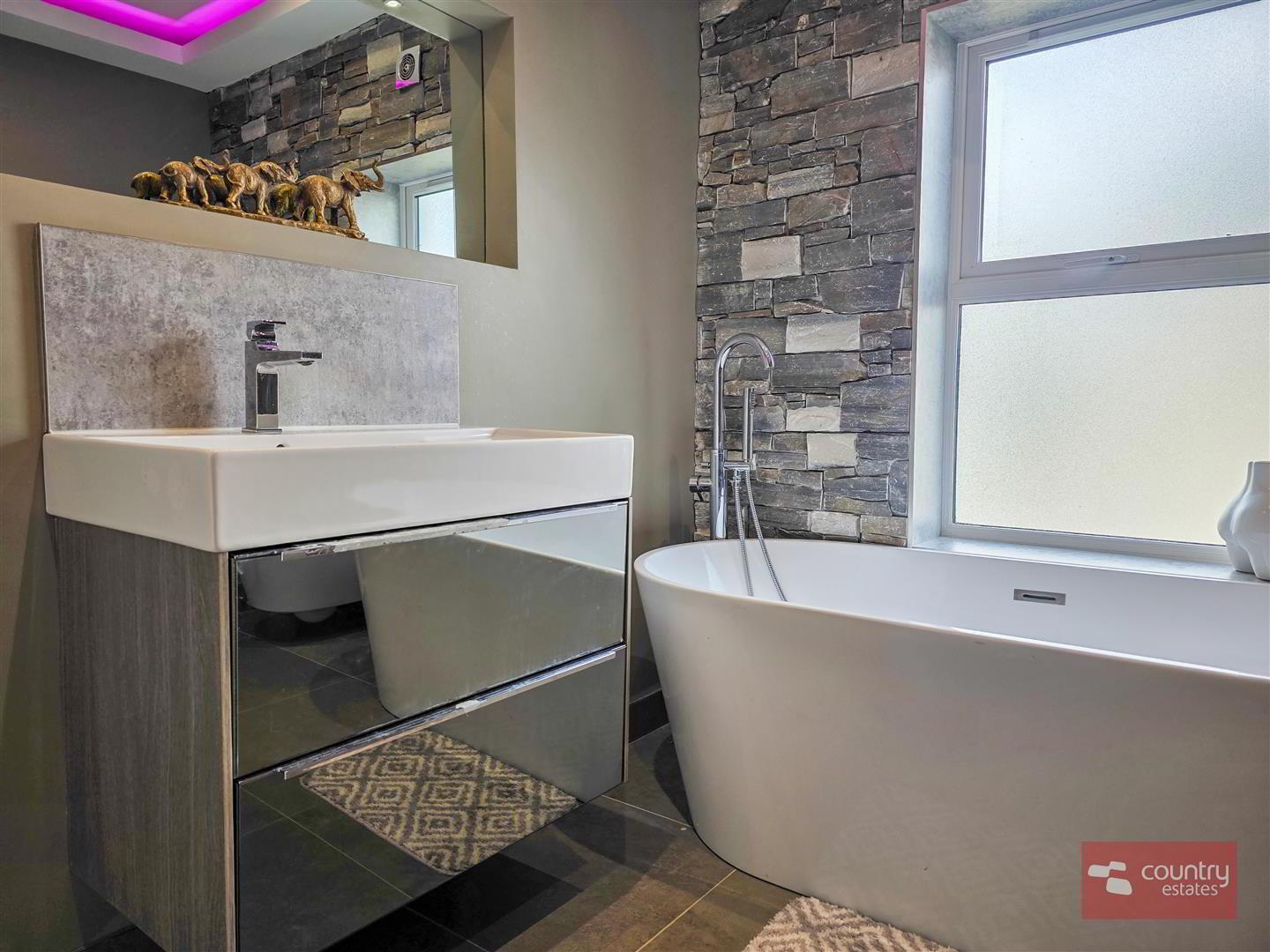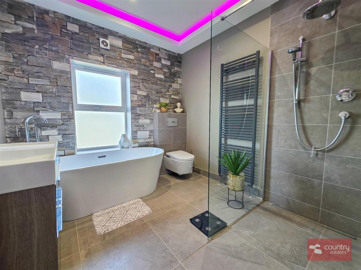 - Comprising free standing double ended bath with floor mounted tap and hand shower attachment, fully tiled step in shower with drench style shower head, vanity unit wash hand basin with monobloc tap and a button flush WC. Coffer style ceiling with RGB LED lighting and built in ceiling Bluetooth speaker system. Stone cladded feature wall. Tiled floor.