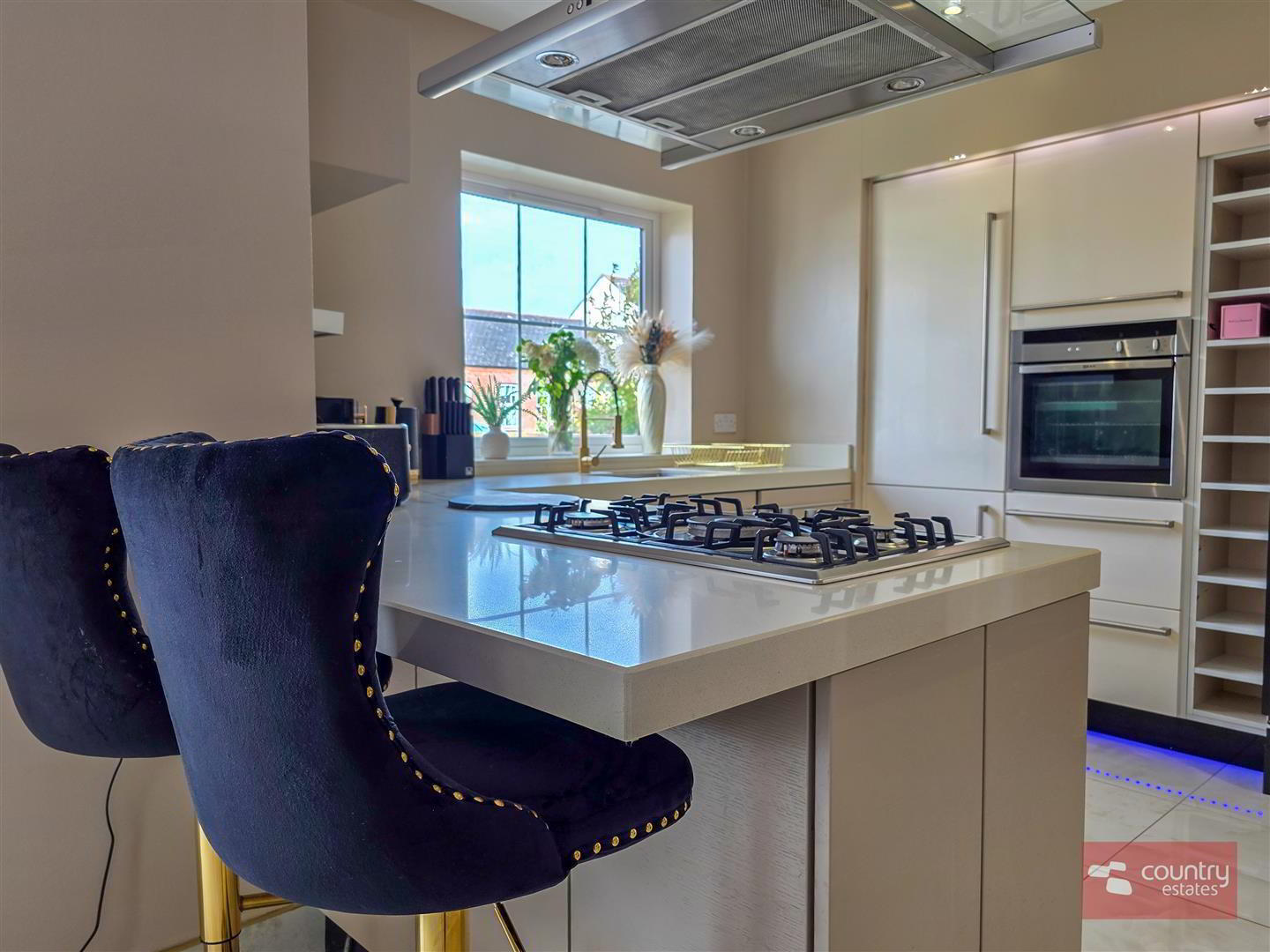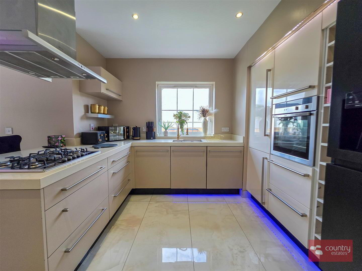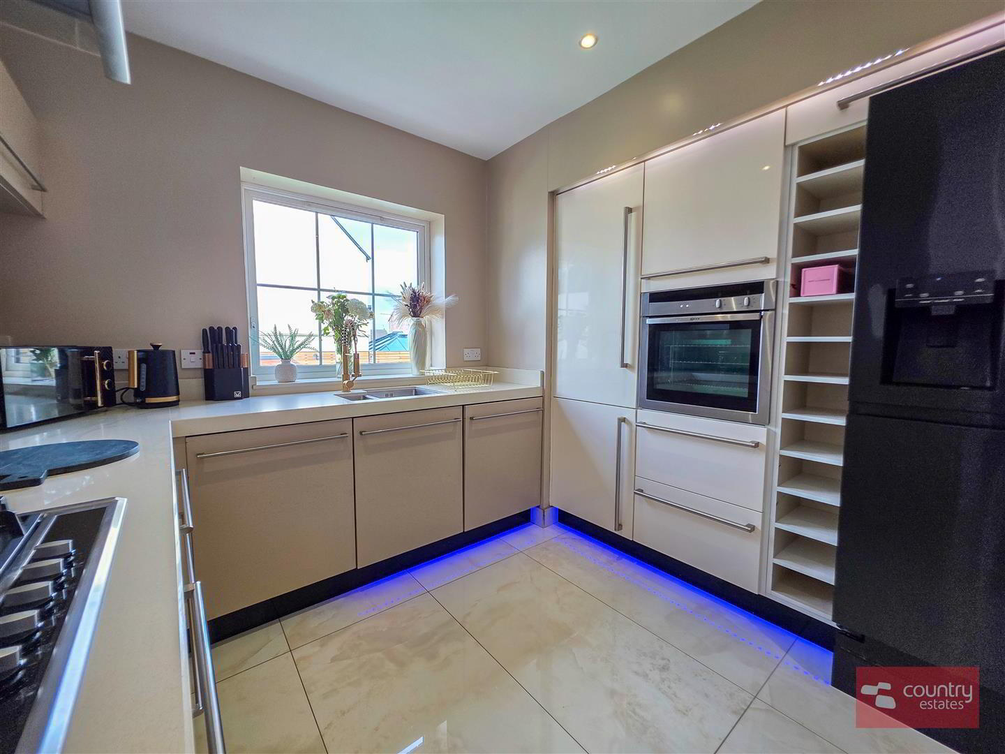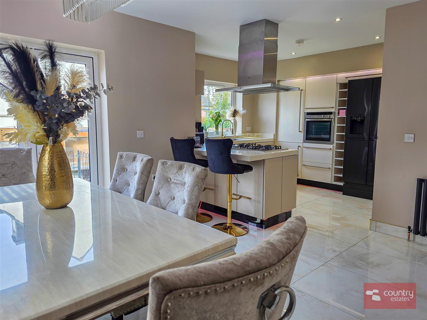 - Equipped with a comprehensive range of high and low level fitted units in gloss finish and contrasting solid quartz work surfaces and up stands. Undermounted one and a half bowl stainless steel sink unit with pull out mixer tap. Boasting a range of Neff integrated appliances to include a five ring gas hob with overhead extractor fan housed in stainless steel chimney, eye-level oven and dishwasher. Space for free standing American style fridge freezer. Marble effect tiled flooring through dining and utility. PVC double glazed French doors to rear patio. Fitted ceiling bluetooth speaker system.