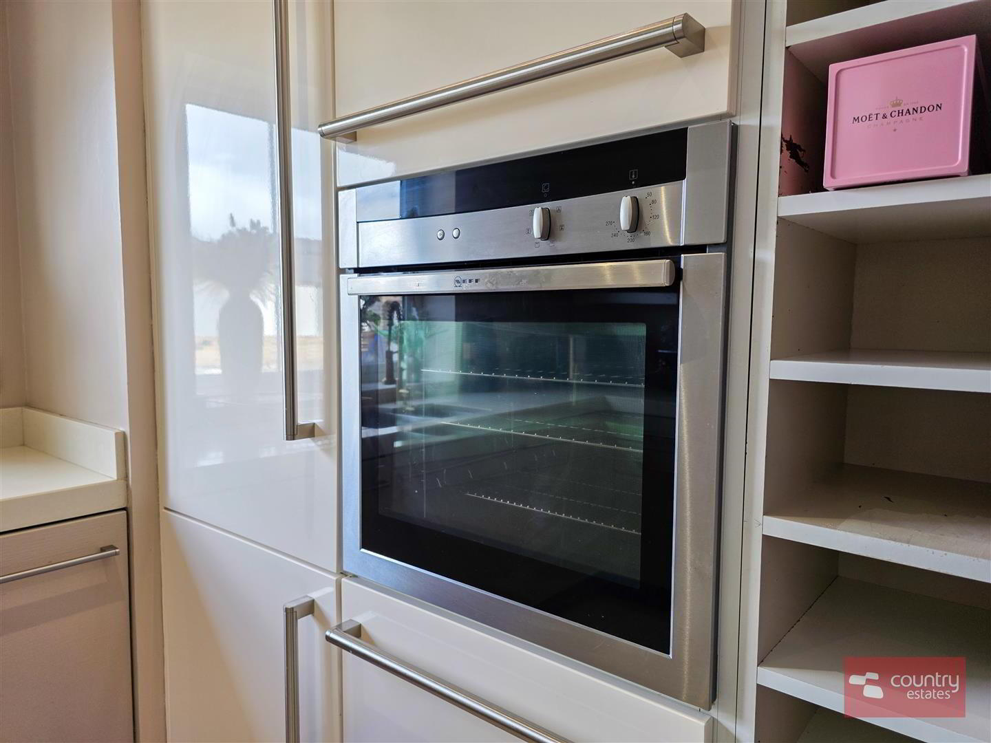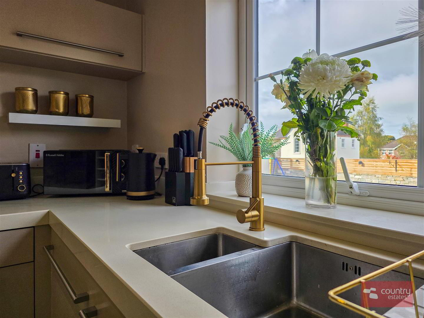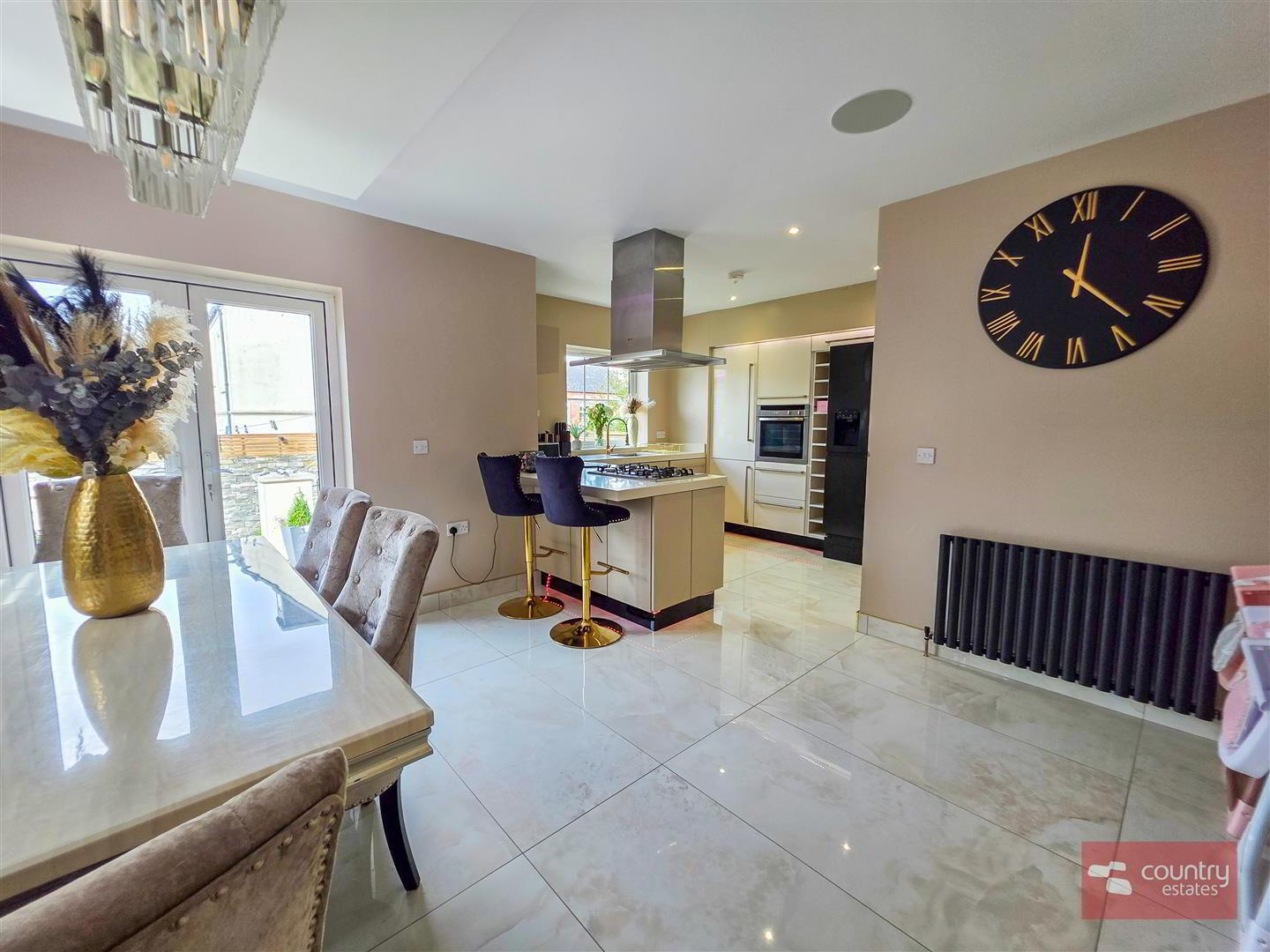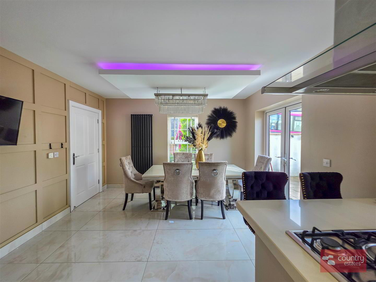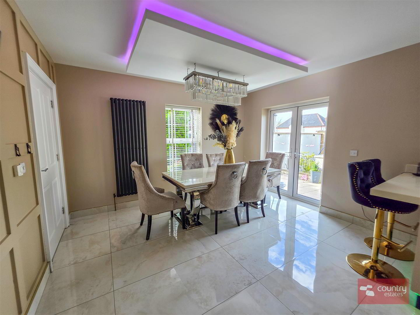 - Equipped with a comprehensive range of high and low level fitted units in gloss finish and contrasting solid quartz work surfaces and up stands. Undermounted one and a half bowl stainless steel sink unit with pull out mixer tap. Boasting a range of Neff integrated appliances to include a five ring gas hob with overhead extractor fan housed in stainless steel chimney, eye-level oven and dishwasher. Space for free standing American style fridge freezer. Marble effect tiled flooring through dining and utility. PVC double glazed French doors to rear patio. Fitted ceiling bluetooth speaker system.