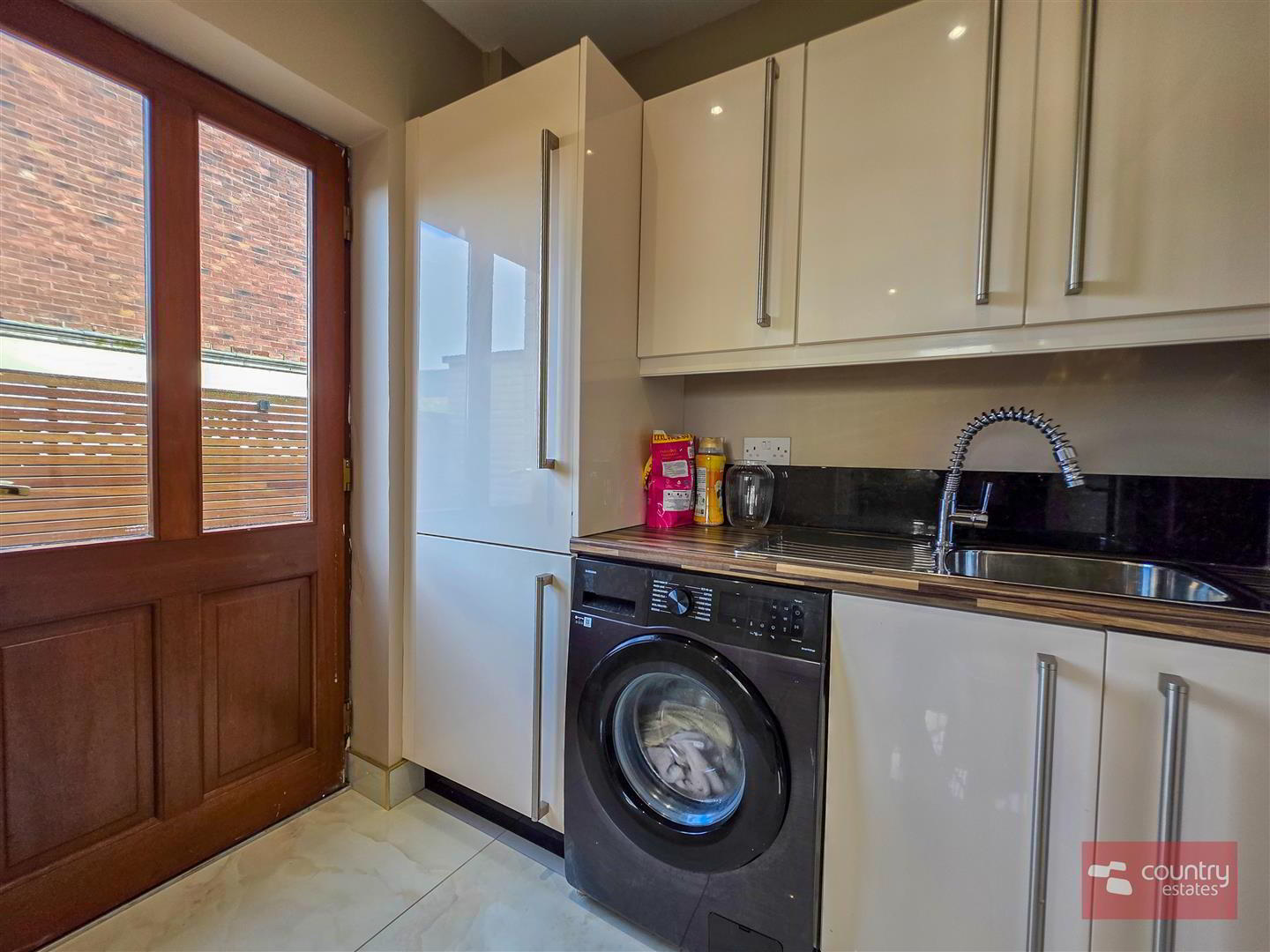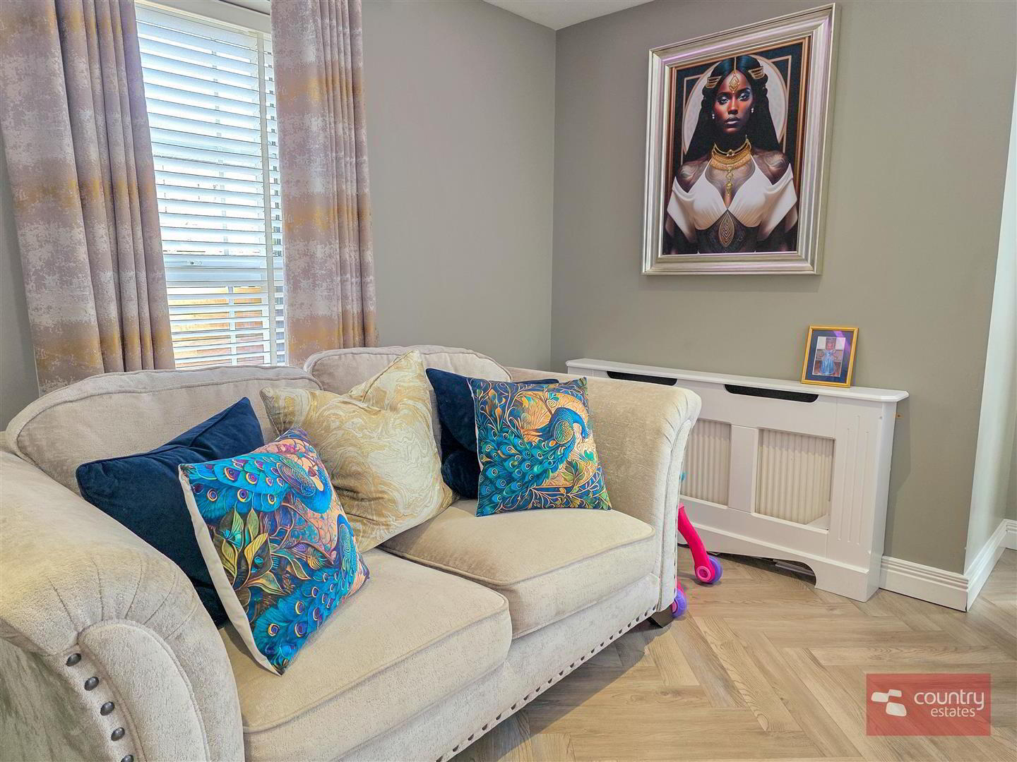 Set over three floors, the home features a welcoming entrance hall, furnished cloakroom, bright bay-fronted lounge, and an open-plan kitchen/dining area with luxury quartz worktops and integrated Neff appliances. A separate utility room adds further practicality.