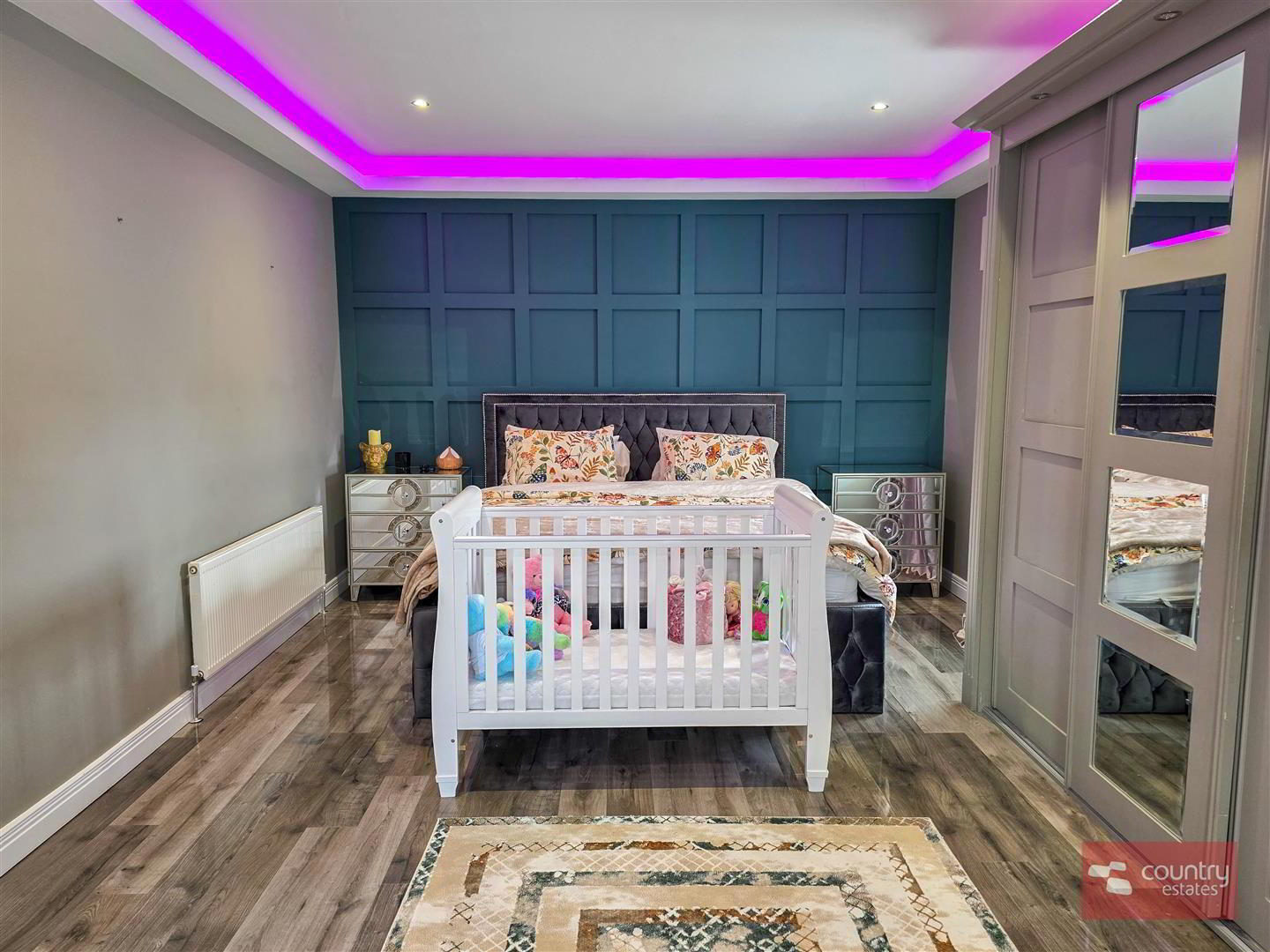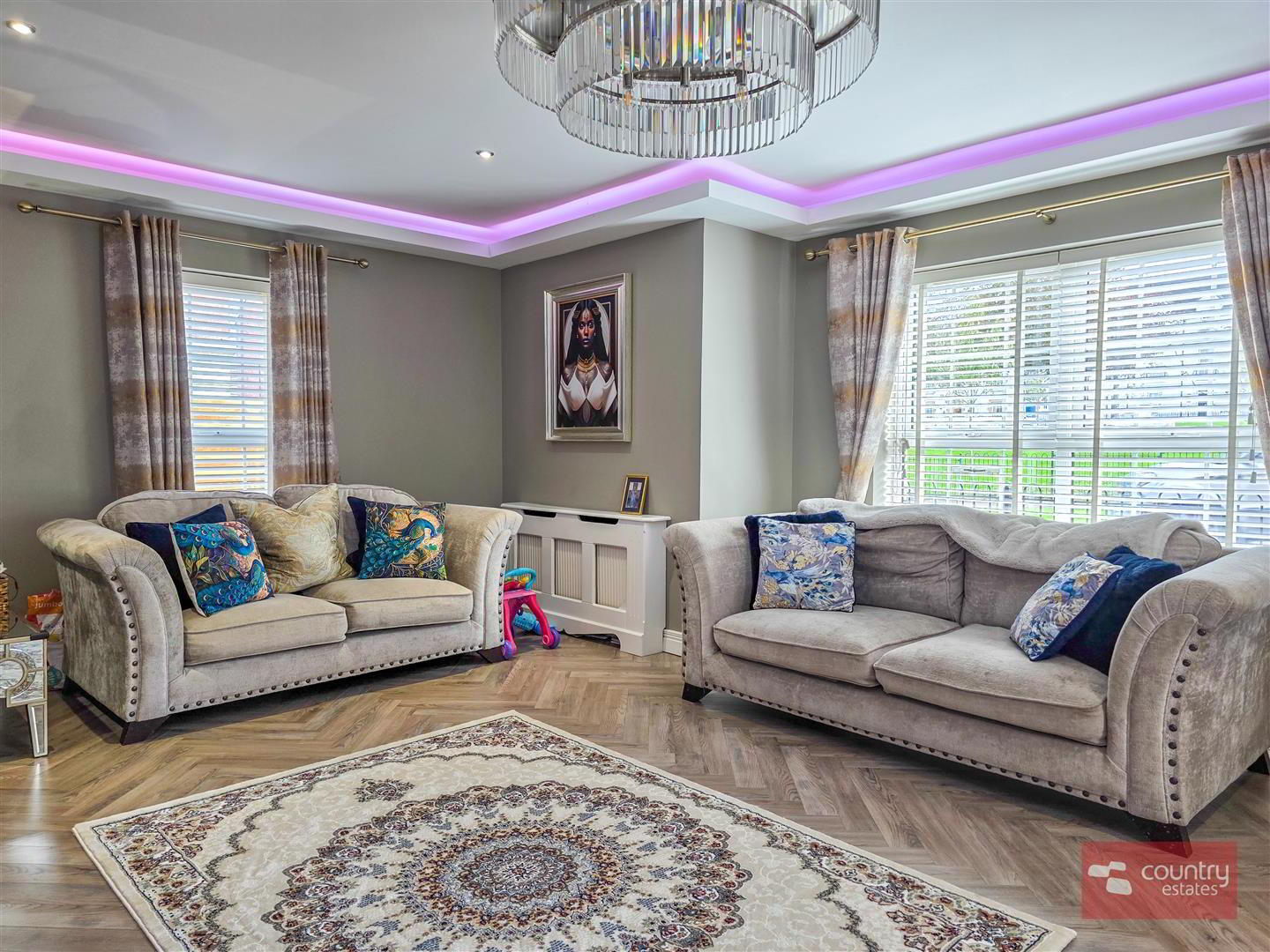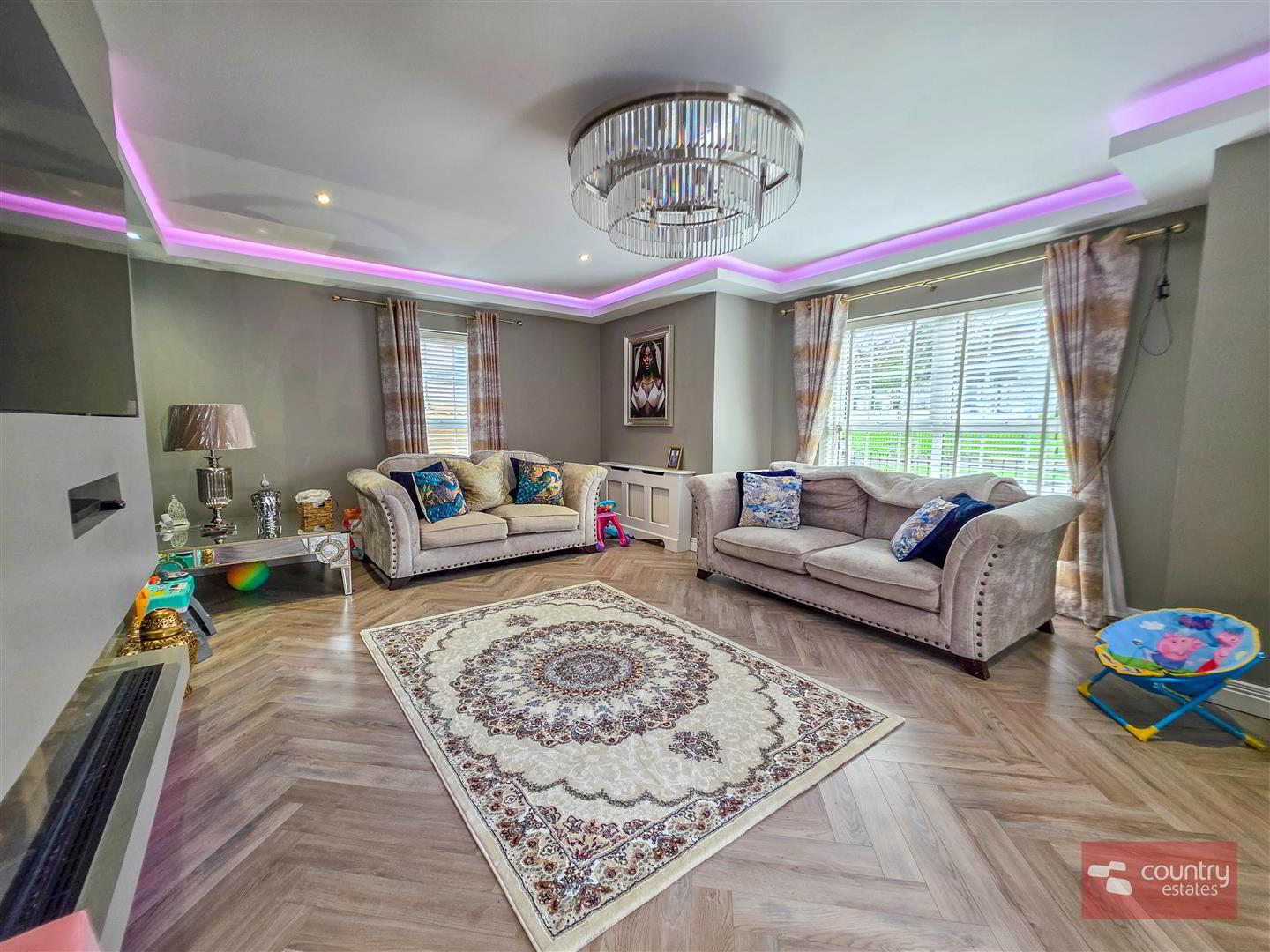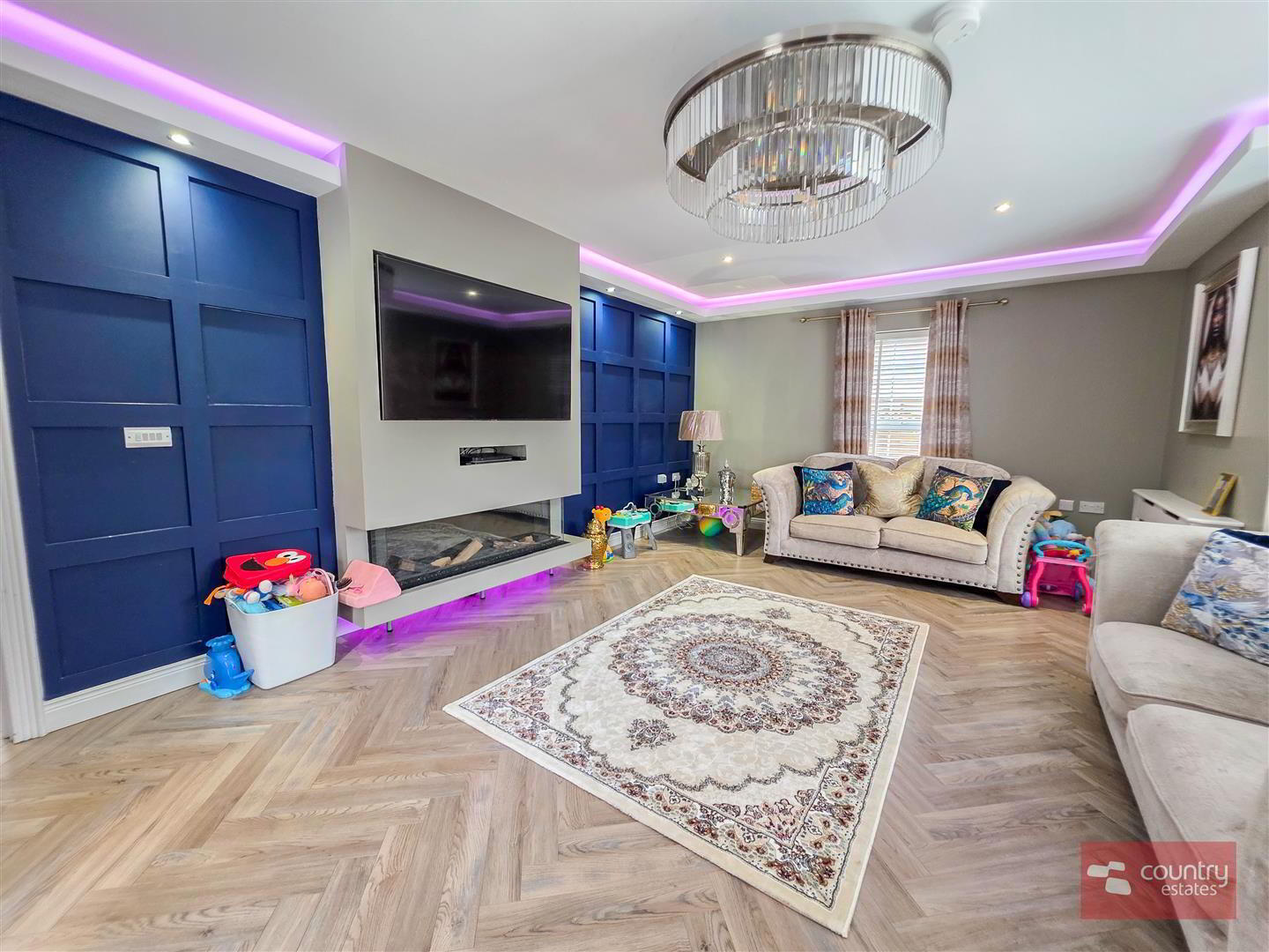 - into Bay window. Feature media wall with inset glazed electric fire. Quartz window sills. Coffer ceiling effect with RGB mood lighting. Recessed down lighting. Fitted ceiling bluetooth speaker system.