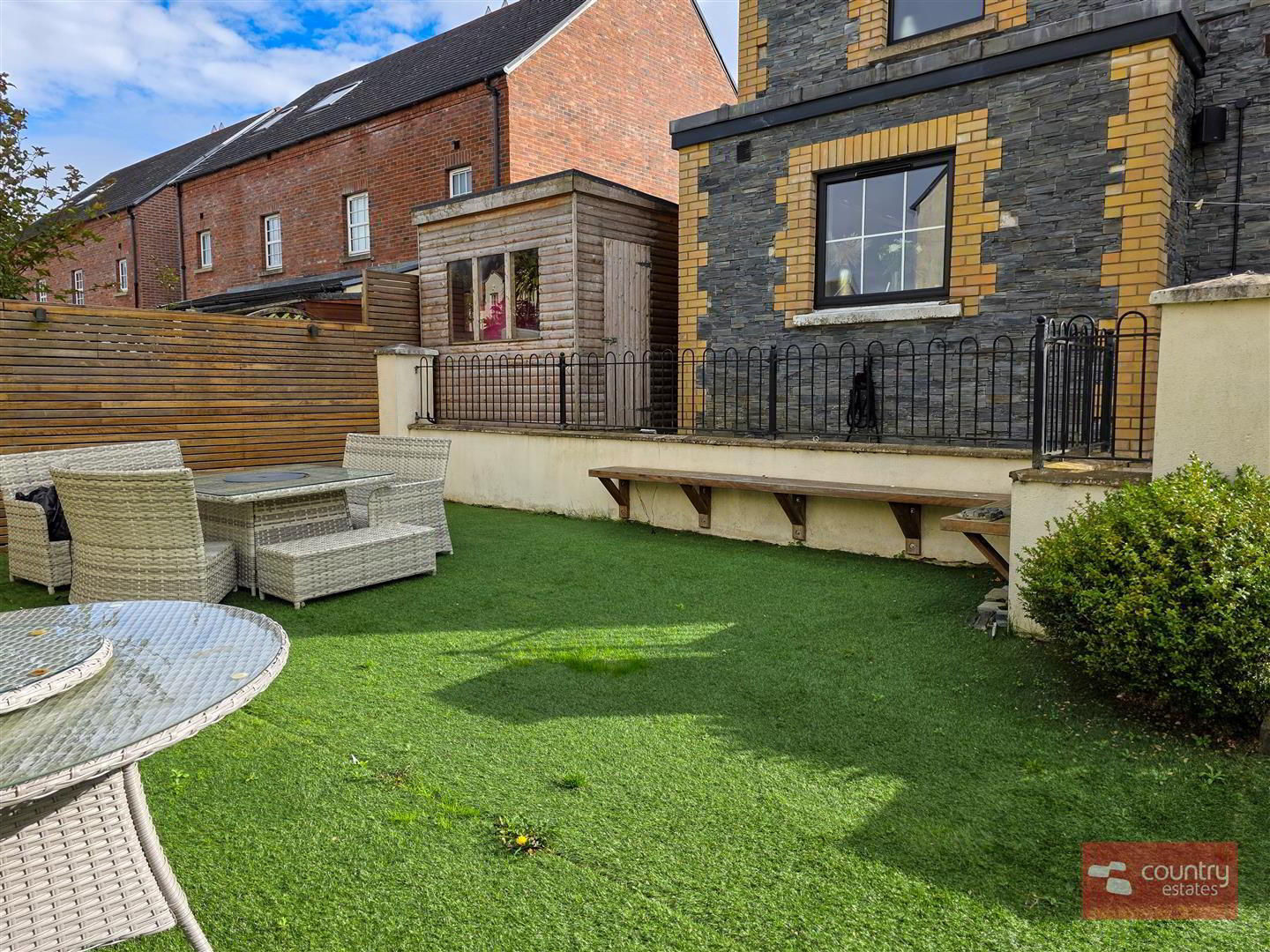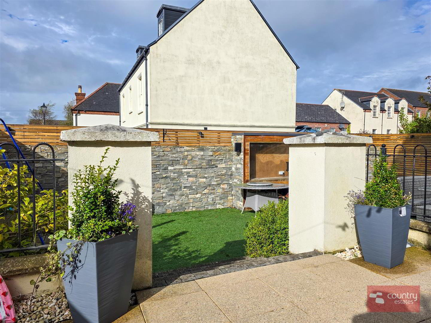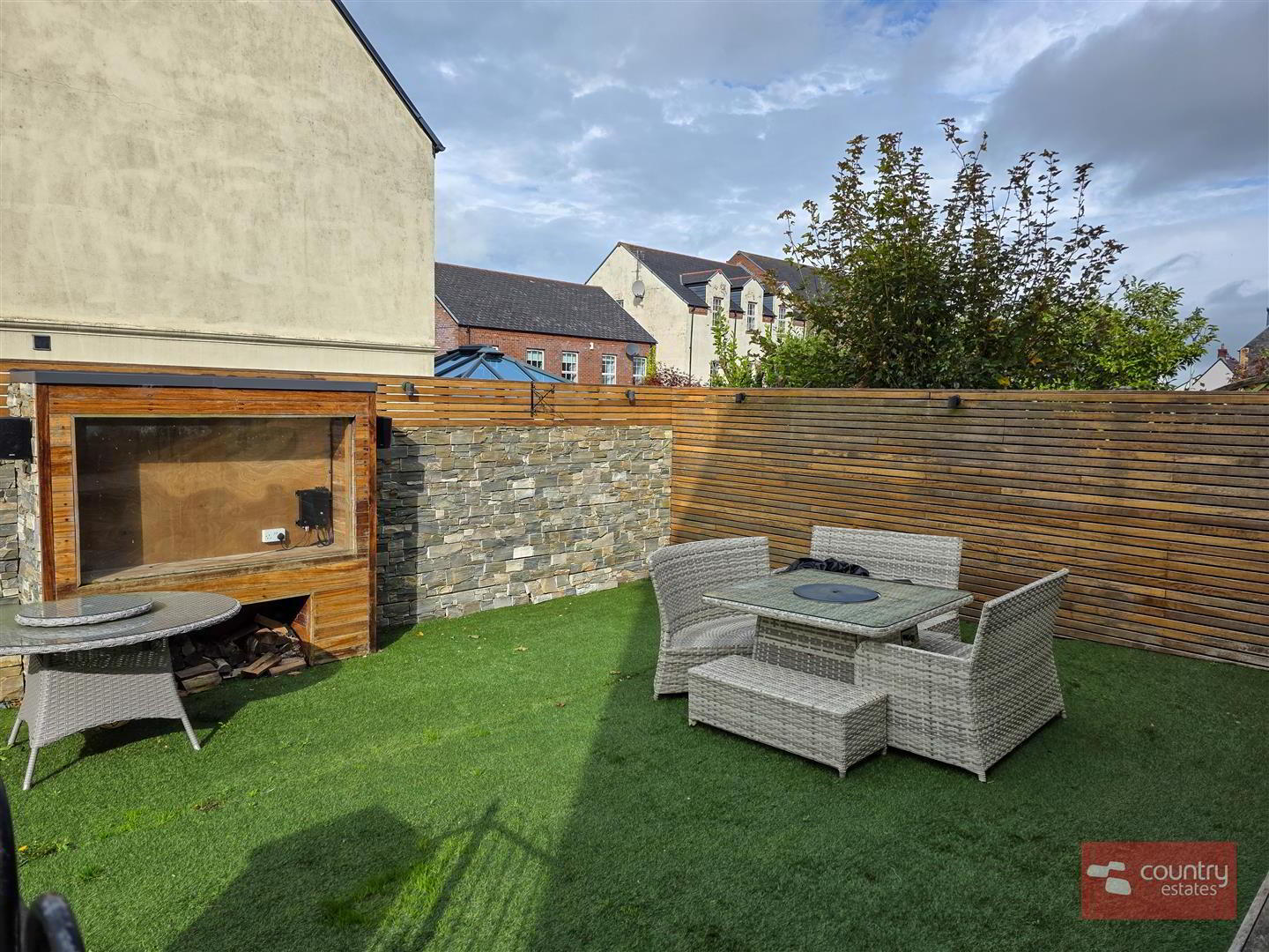 Private enclosed landscaped garden to rear with paved patio area. Low maintenance faux grass with decking area. Waterproof TV enclosure with power points. Screened by perimeter fence and stone wall. Outside power point. Outside tap.