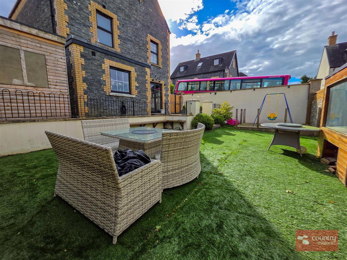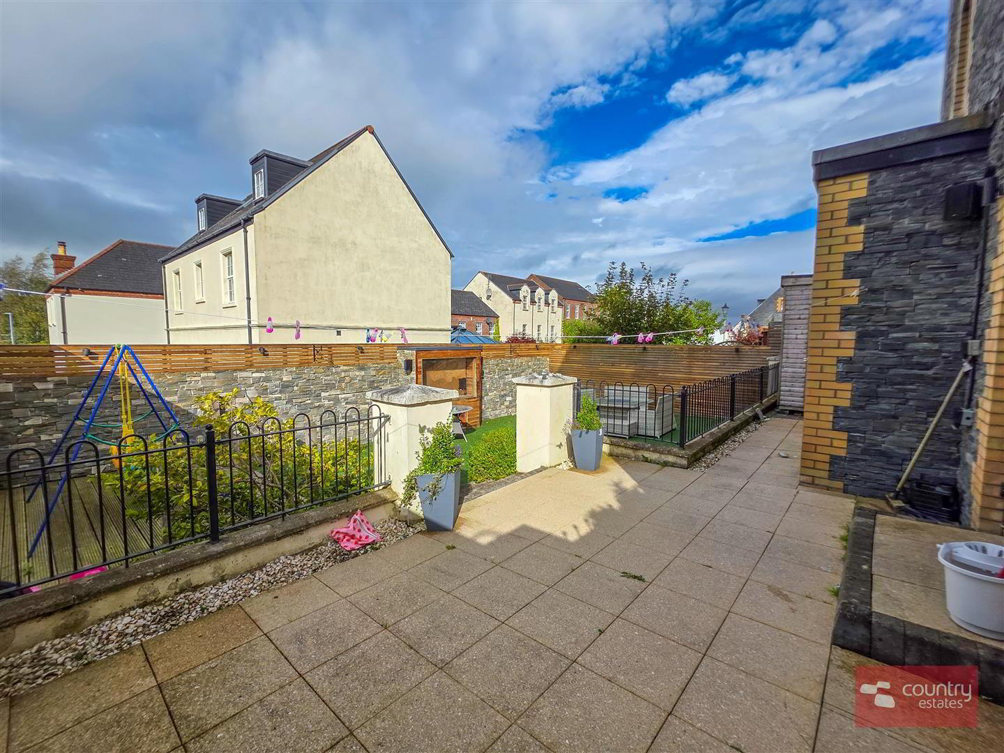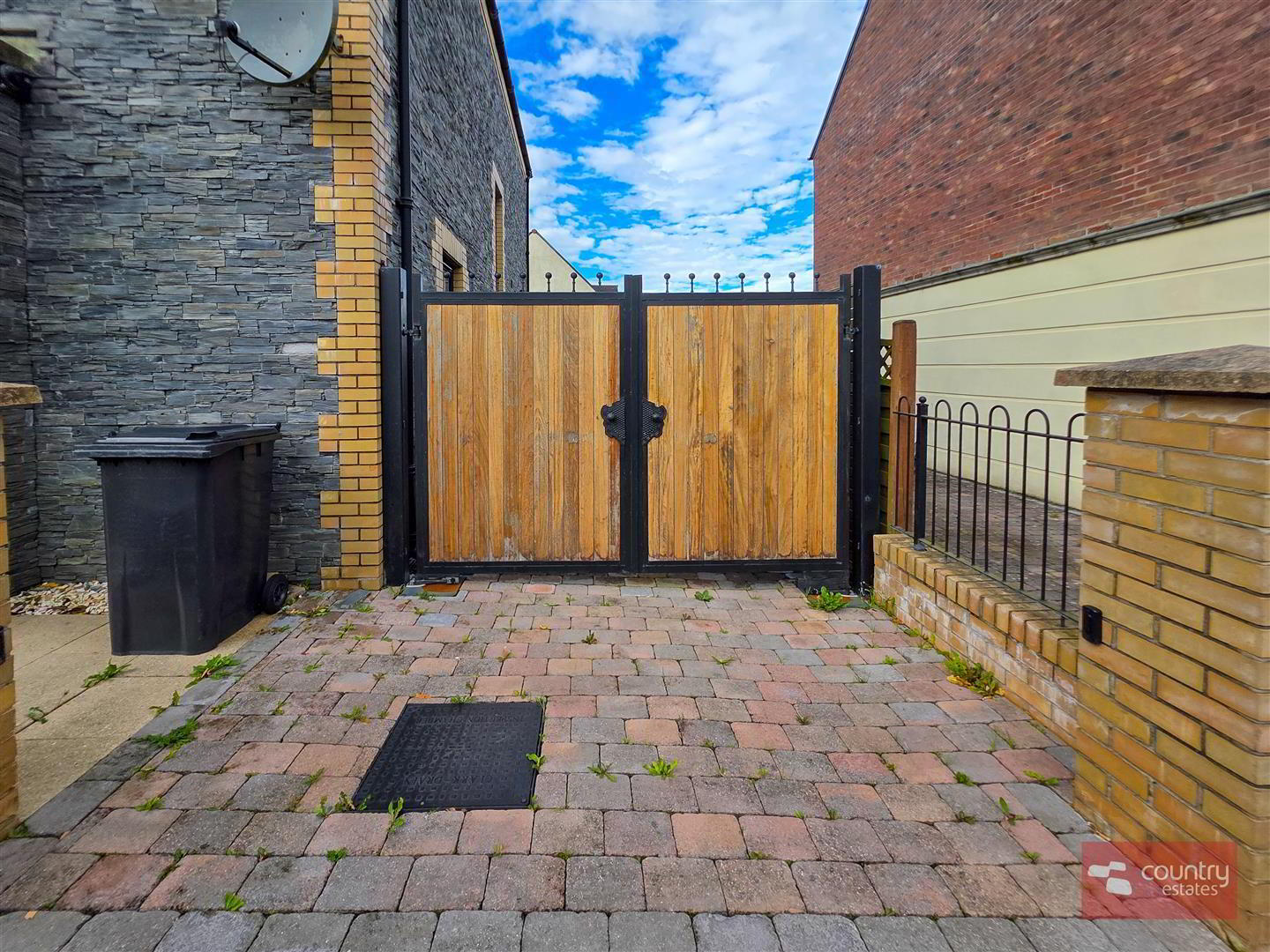 Private enclosed landscaped garden to rear with paved patio area. Low maintenance faux grass with decking area. Waterproof TV enclosure with power points. Screened by perimeter fence and stone wall. Outside power point. Outside tap.