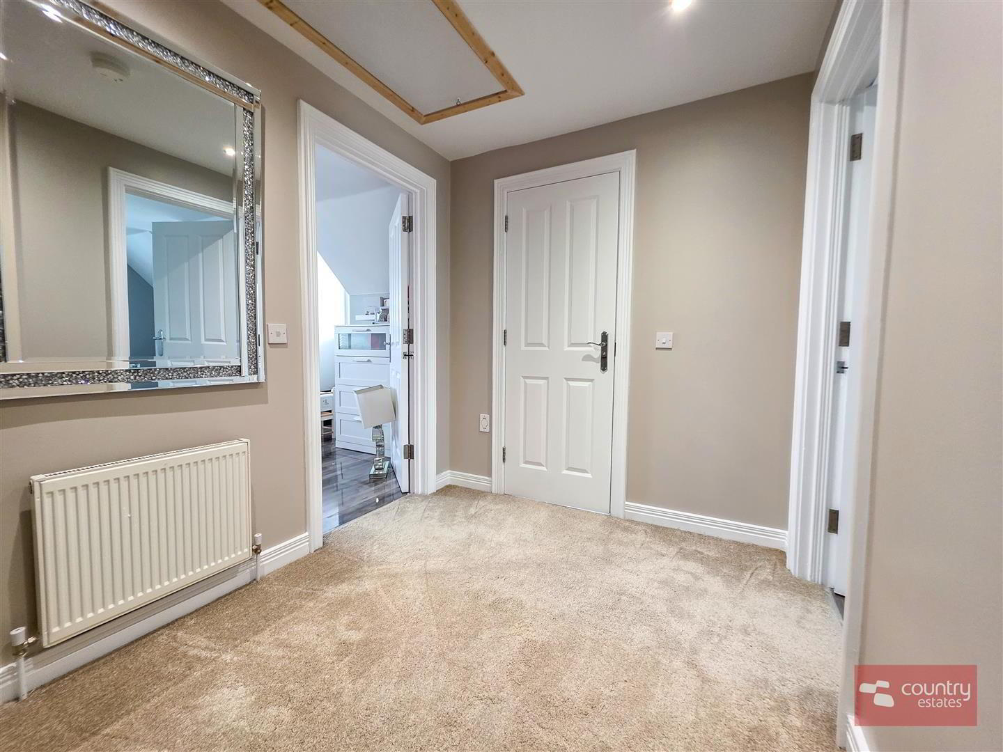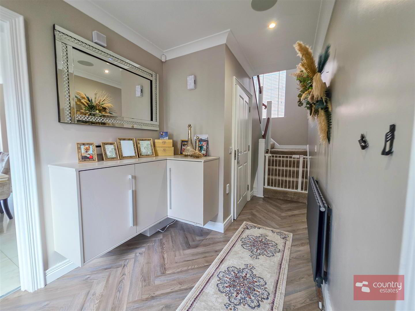 - PVC double glazed front door with leaded insets into entrance hall. Quality Herringbone flooring. Recessed down lighting. Wall mounted high gloss storage units with under lighting. Beam vacuum point.