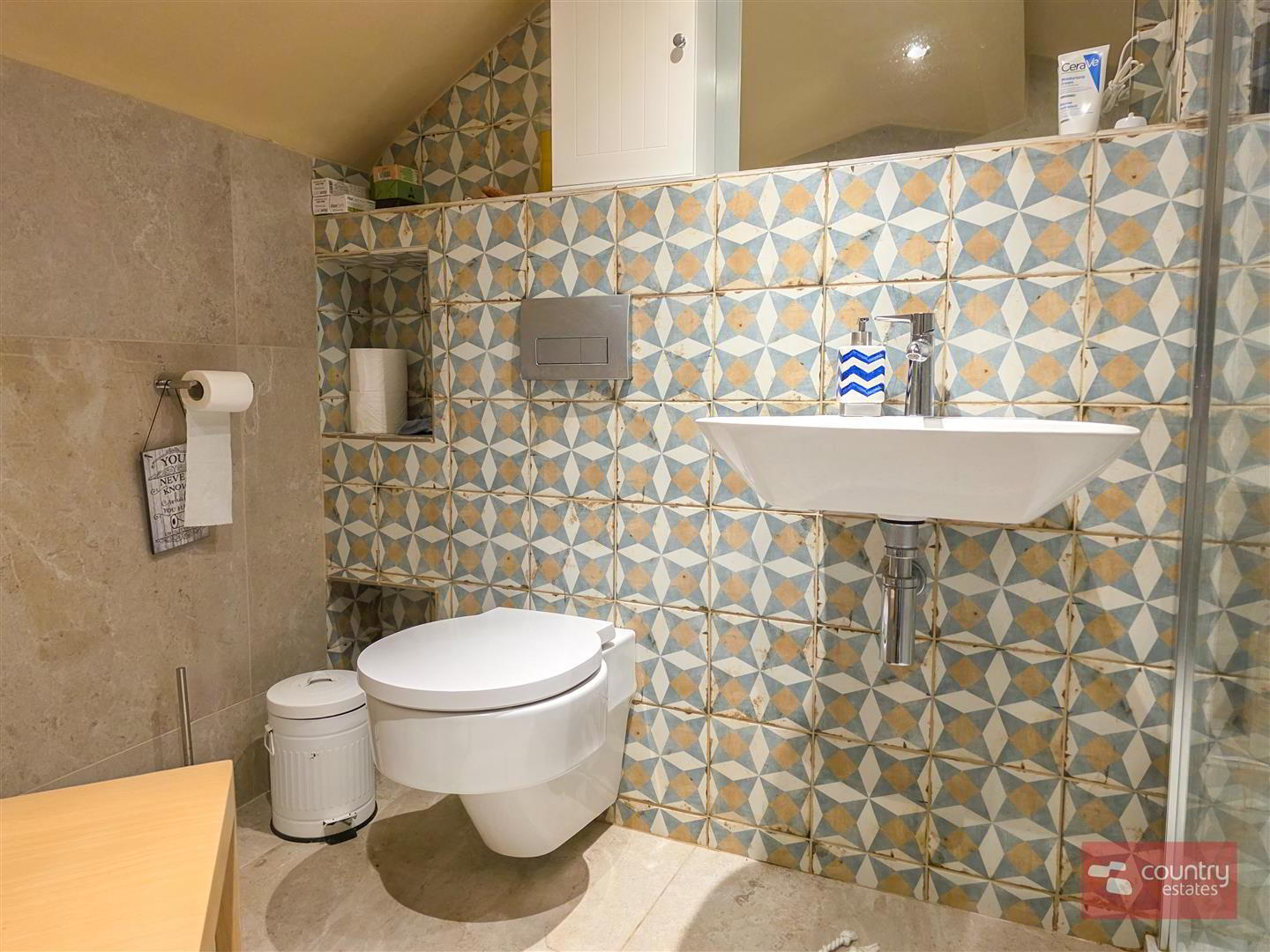 Comprising large step in shower cubicle with thermostatically controlled shower unit, wall mounted wash hand basin with monobloc tap and a wall hung button flush WC. Fully tiled with imported Spanish tiles. Recessed down lighting. Towel radiator.