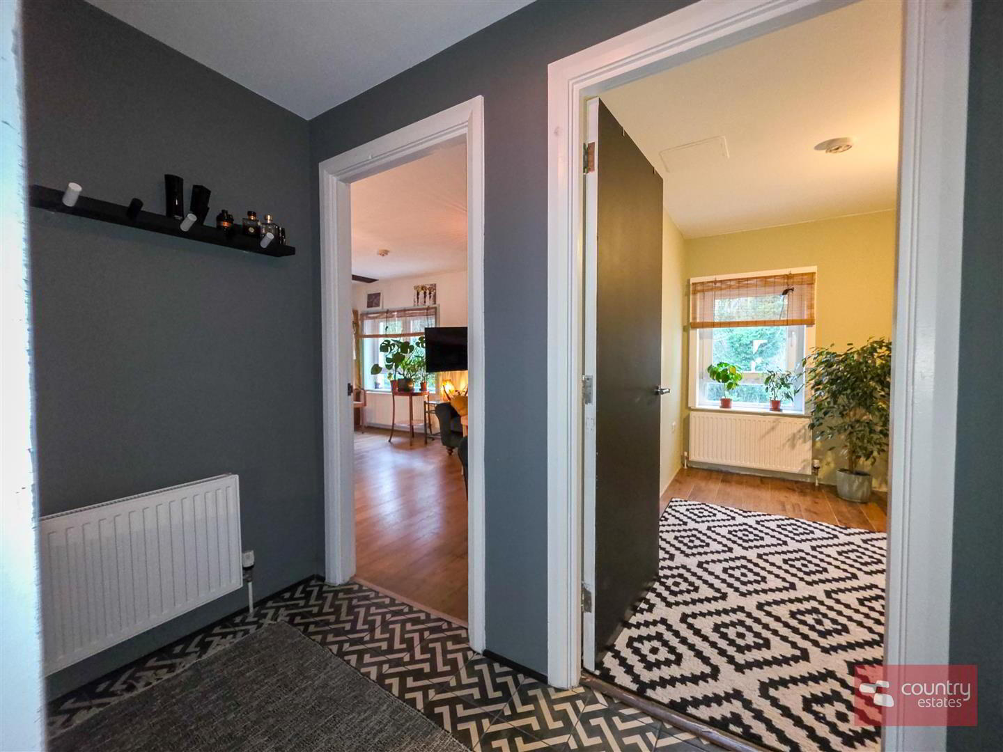 Hard wood front door into well presented entrance hall with tiled floor. Storage cupboard with plumbing for washing machine. Boot bench with overhead storage.