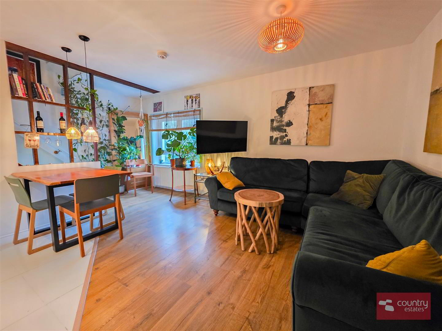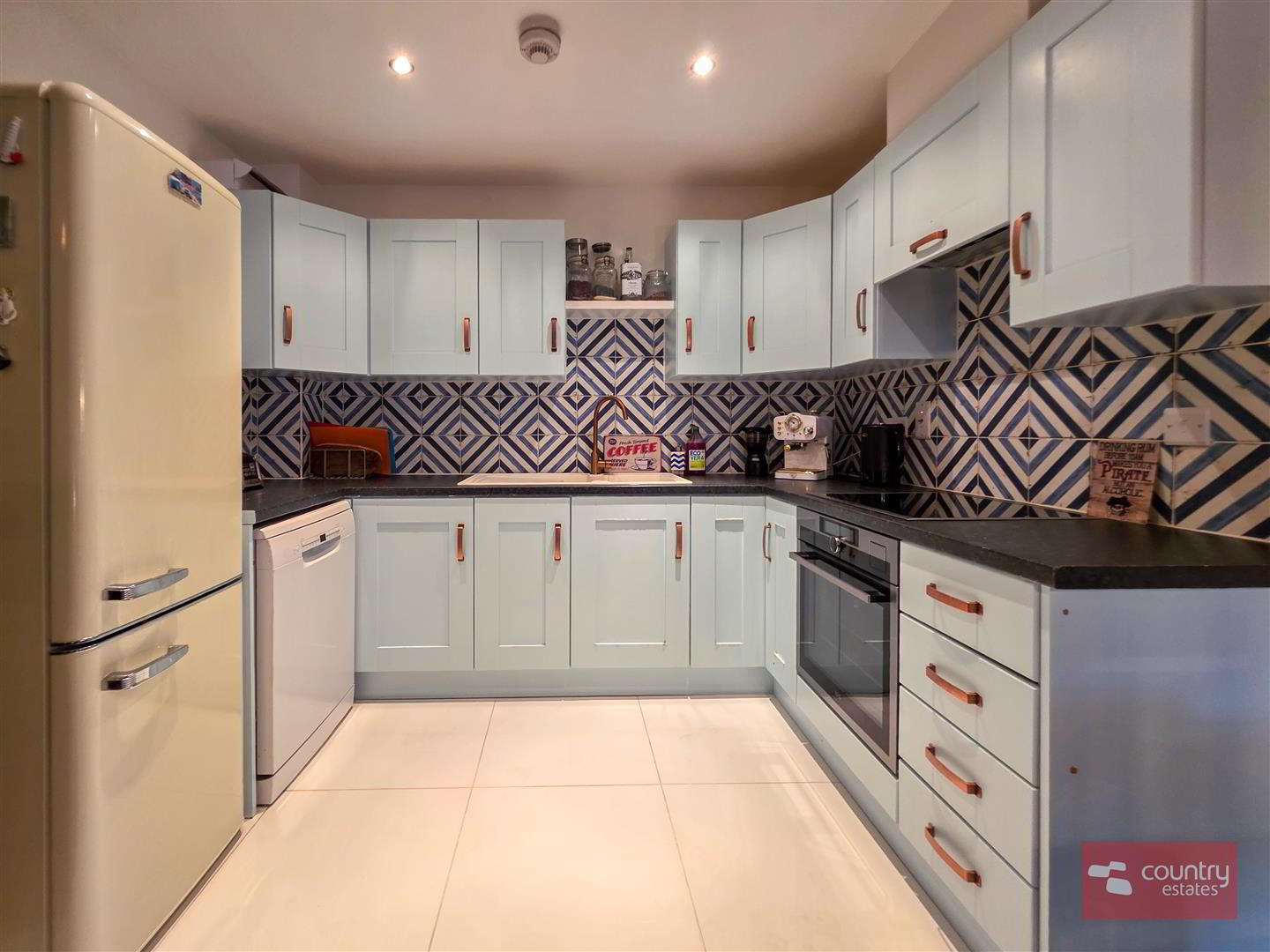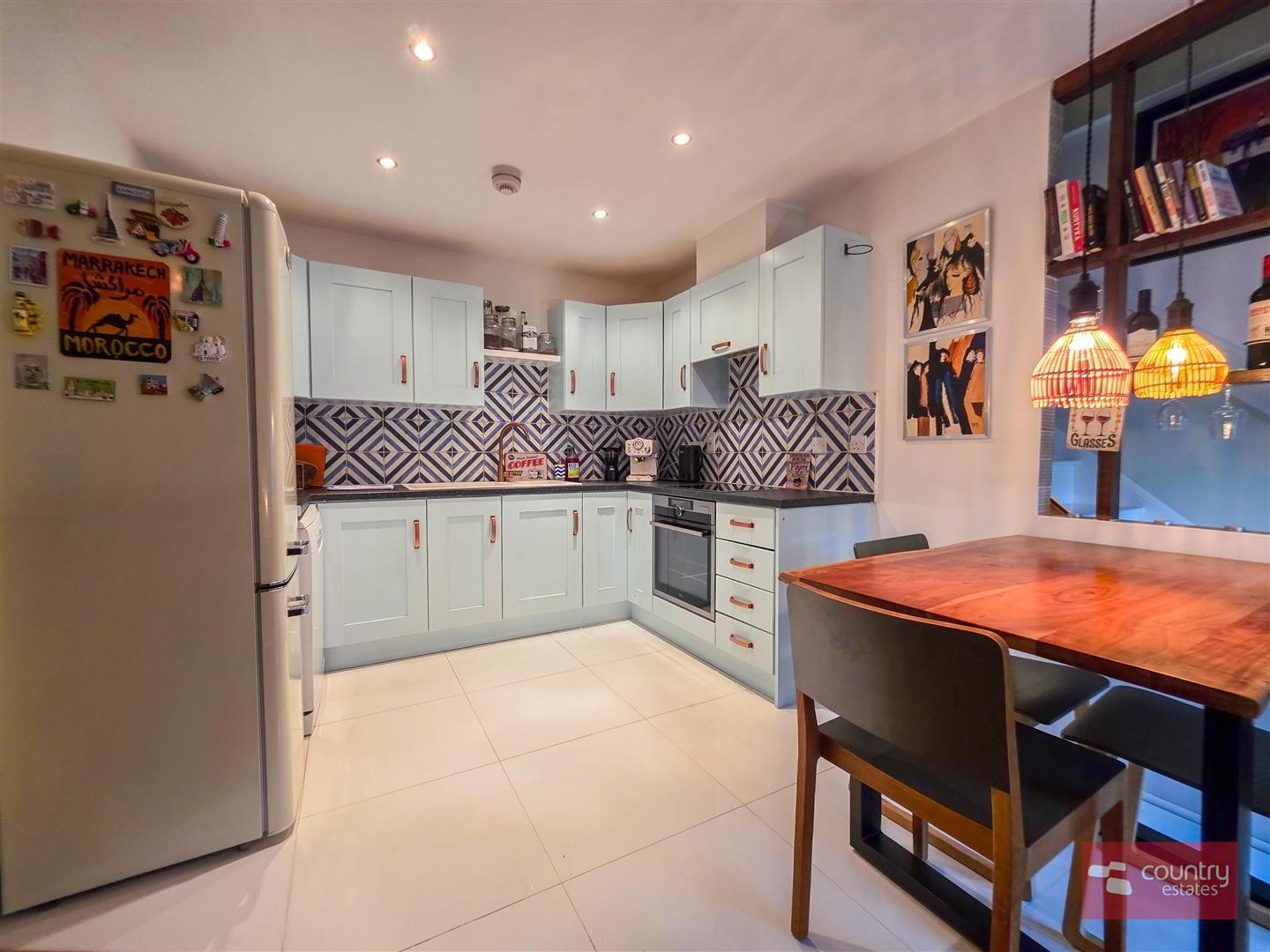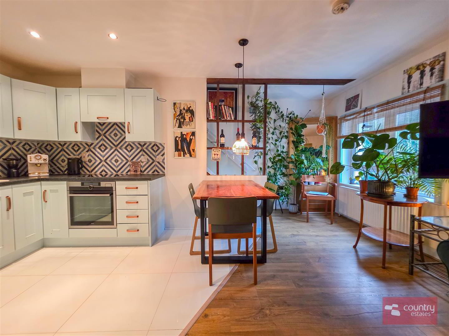 Lounge with high quality laminate flooring. Open into contemporary fitted kitchen equipped with a comprehensive range of high and low level shaker style units and contrasting work surfaces. One and a half bowl composite sink unit with swan neck mixer tap. Integrated oven with separate conduction hob and over head extractor fan housed in matching pull out canopy. Plumbed for dishwasher. Space for free standing fridge freezer. Tiled floor. Part tiled walls. Recessed down lighting.
