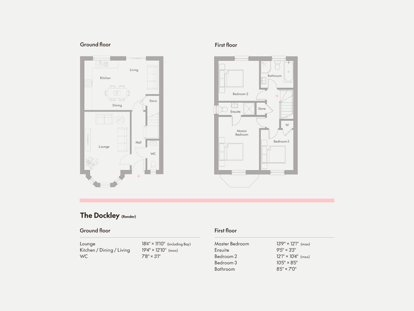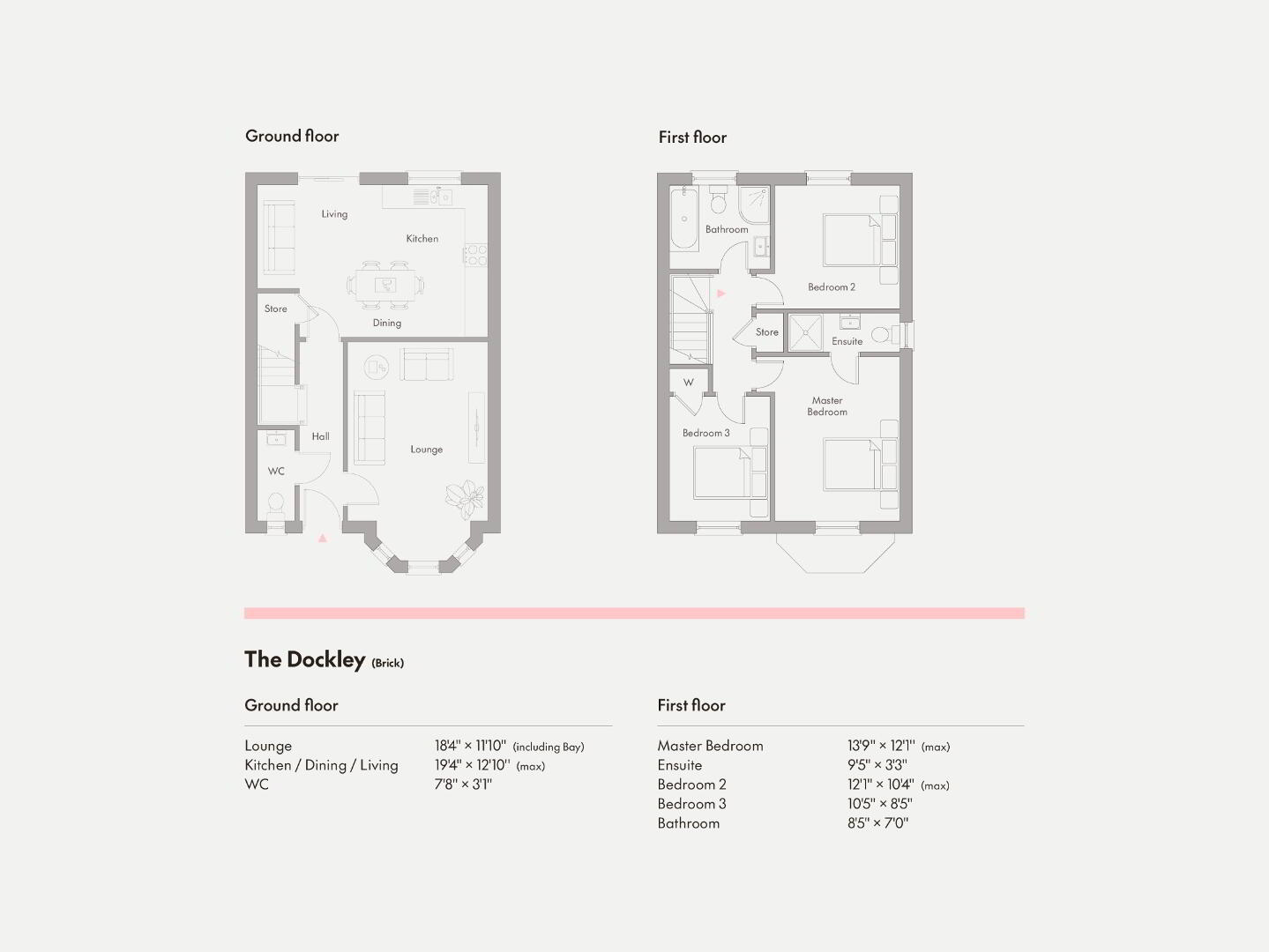 The Dockley at Springwater, Ballyclare, is a beautifully designed three-bedroom detached home, offering spacious and stylish living across two floors. With 1,111 sq ft of well-planned space, the home features an elegant bay-windowed reception room and an open-plan kitchen and dining area. Upstairs, the master bedroom benefits from an ensuite, while three additional bedrooms and a family bathroom provide ample space for modern family life. With its timeless exterior and high-quality interior layout, the Dockley is a perfect blend of classic charm and contemporary comfort.